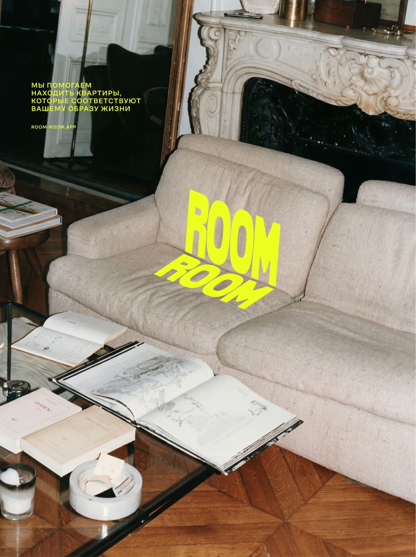 Название бренда ловко вписывается в фото интерьера, встраиваясь в перспективу фотографий. Стилистика съёмки нарочито легкая и небрежная. Это квартиры, которые соответствуют вашему образу жизни.