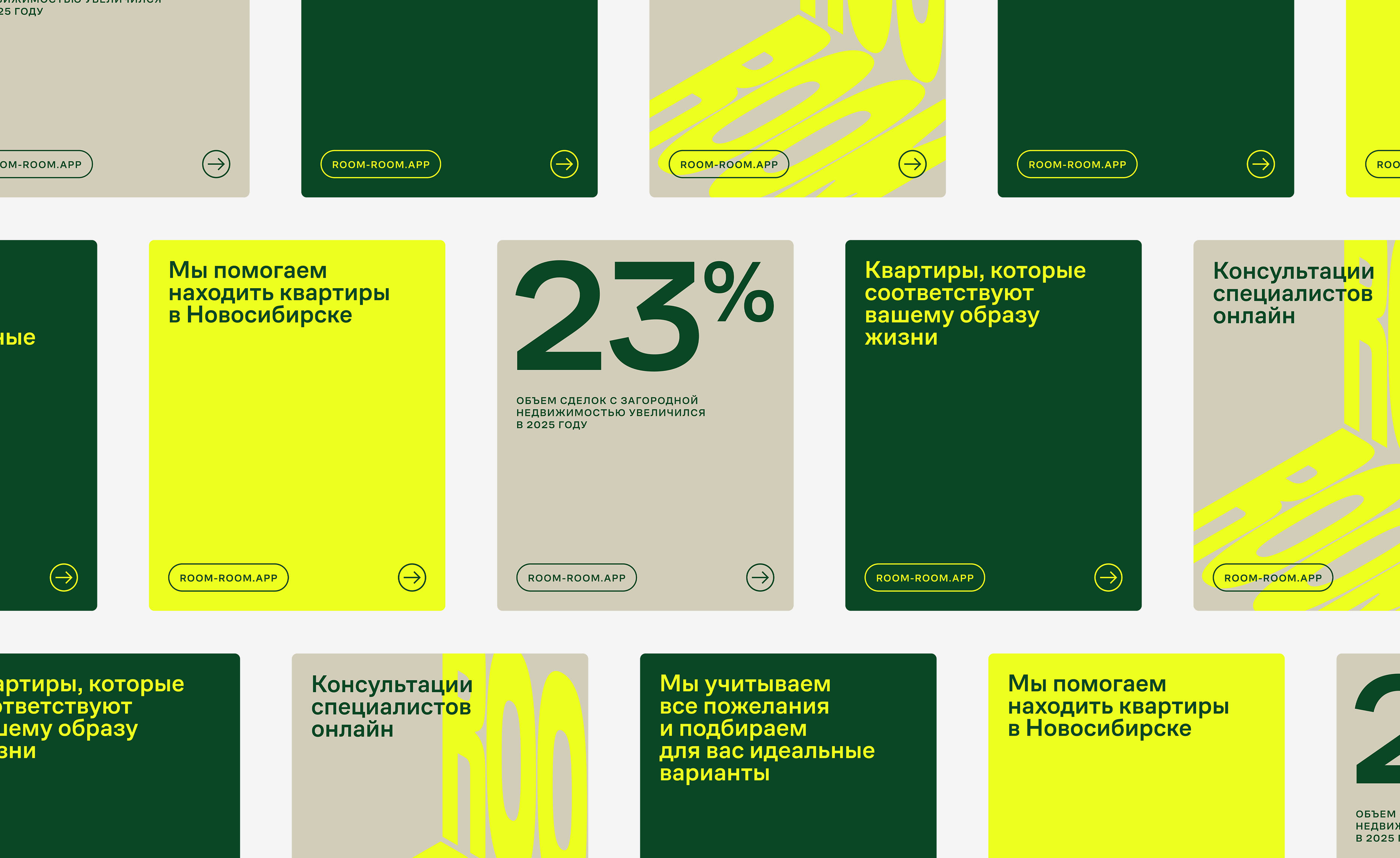 Нейминг — повторение слова «Room». Редупликация задаёт ритм прокрутки: комната за комнатой. Игривое, музыкальное звучание, легко тянет на слоганы и джинглы. Вжух-вжух, рум-рум. Комфорт произношения, легкость, профессионализм и экспертность. Это название про дом, квартиру и образ жизни, а не про недвижимость.