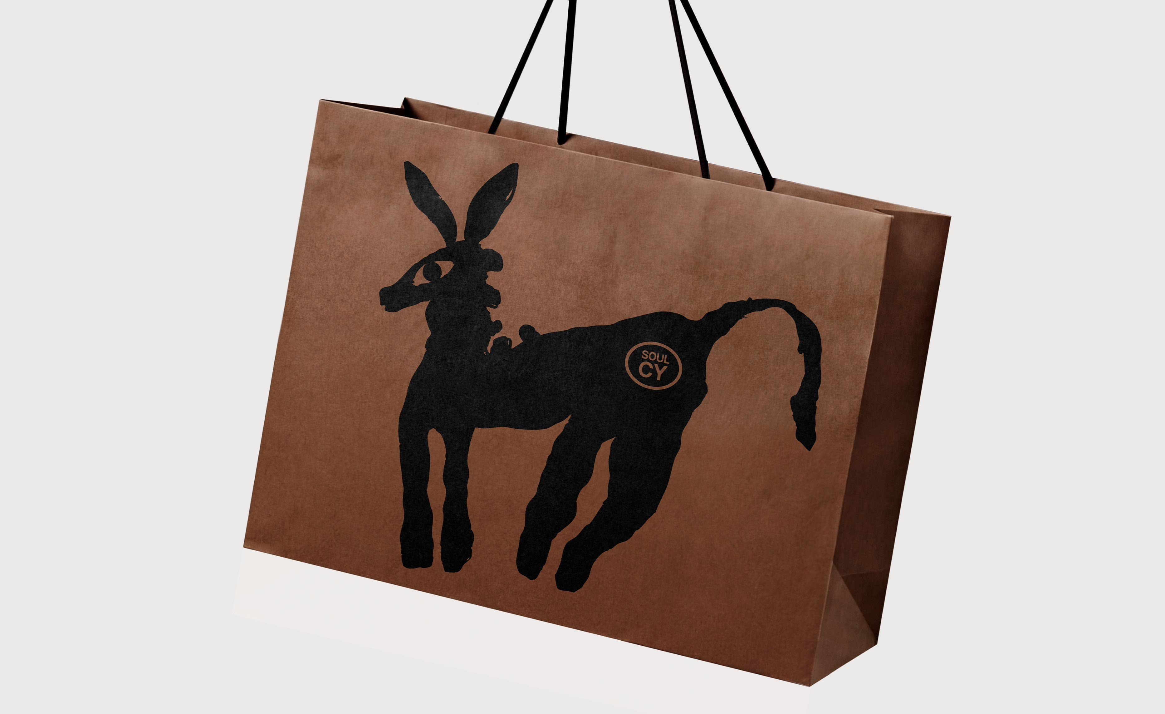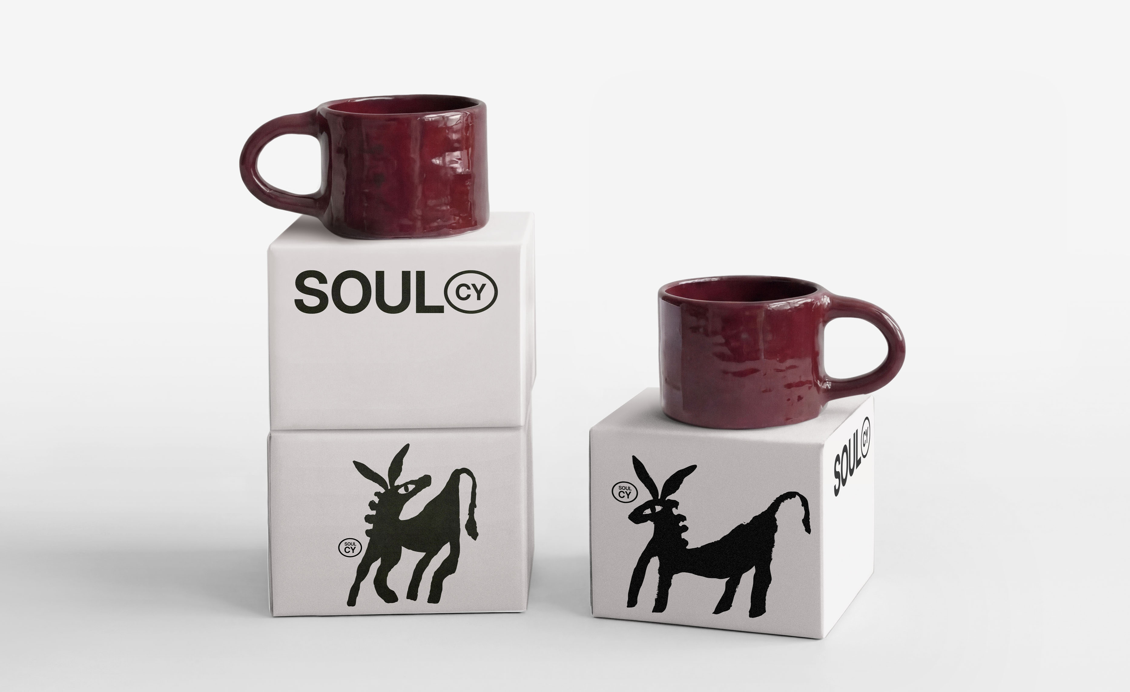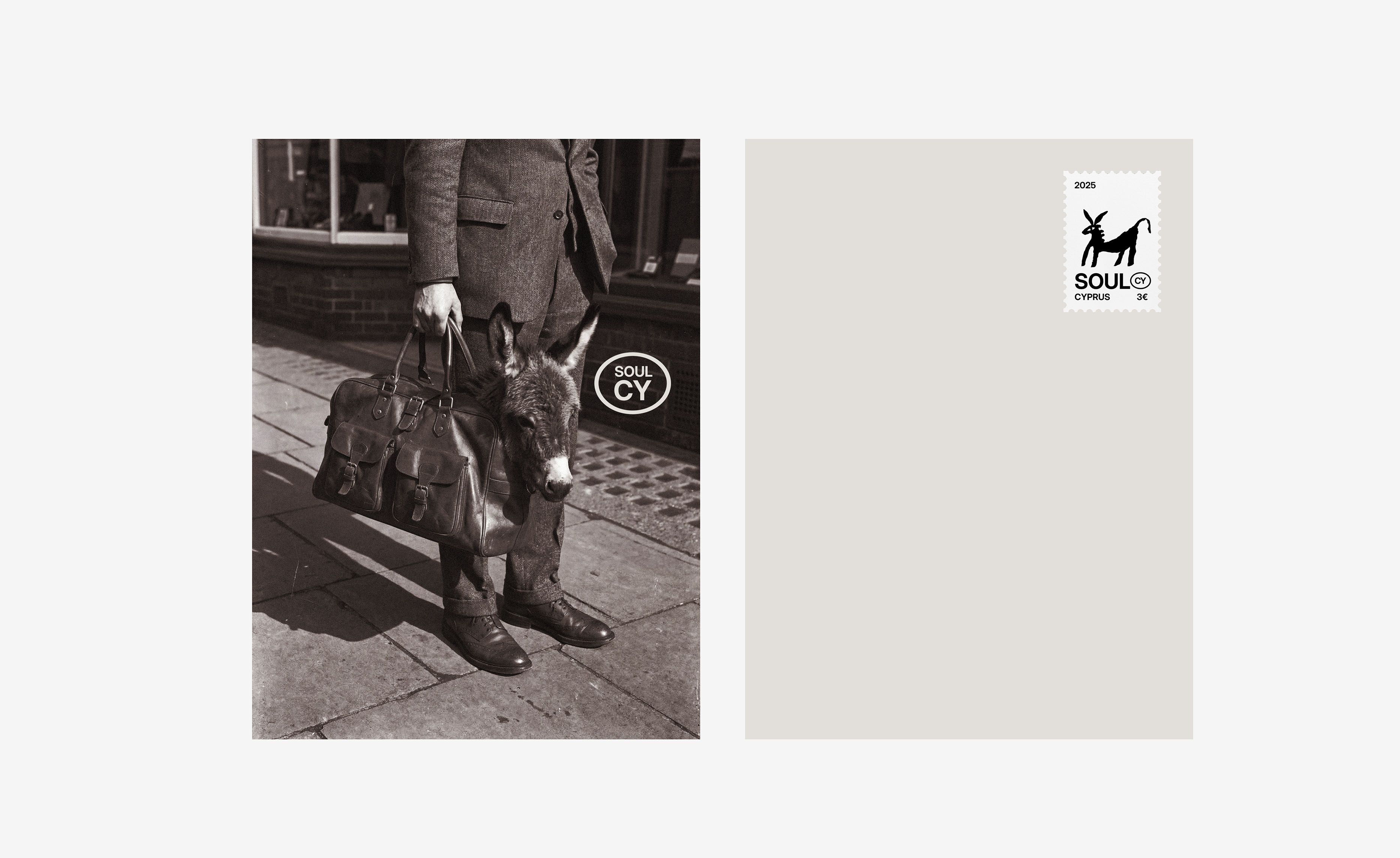 Название бренда SOUL CY — «Душа Кипра» — набирается простым гротеском. Название региона заключается в овал, отсылая, с одной стороны, к классическим региональным наклейкам, а с другой — к копытцу ослика.
